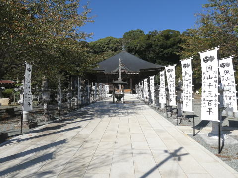 | さらに石段を上り、観音堂の前に出た。(写真下) まだ時刻が早いせいか参拝客の姿は見られない。目に付くのは、左右に立ち並ぶ「開山千三百年」の白い幟だ。飯山観音長谷寺は今年、開山1300年を迎えるという。前に進み、観音堂を参拝。 |