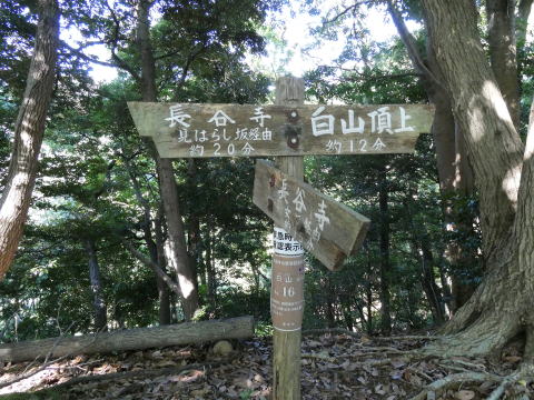 | 尾根の背に上ると道標が立っていた。(写真下) 左は見はらし坂経由長谷寺とある。ここで右折して白山頂上へ向かう。 |