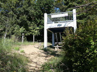 | 女坂と言っても、結局、頂上付近は急坂となる。ハアハア言いながら登っていくと白い展望台が見えた。(写真下) ようやく白山頂上だ。 |