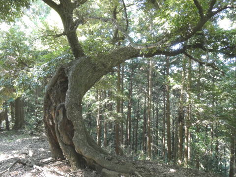 白山展望台を出発し、順礼峠に行く前にスダジイの大木に寄り道する。(写真下) 根元から反り返っている姿は、相変わらず健在だった。とても不安定のように見えるが、反り返った部分のすぐ先で垂直に伸びている枝?(幹並みの太さ)があるのでバランスがとれているようだ。