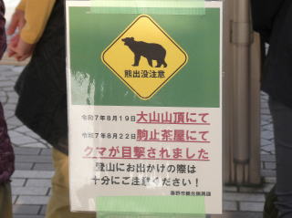 秦野駅バス乗り場にてヤビツ峠行きの列に並ぶ。平日の場合、ヤビツ峠行きは午前中1便だけなので並ぶ登山者は多い。(写真下左) 現在、北海道や東北でクマ被害が頻発しているが、神奈川県でもクマ目撃情報が増えており、この大山でも山頂にて目撃されているようだ。(写真下右)