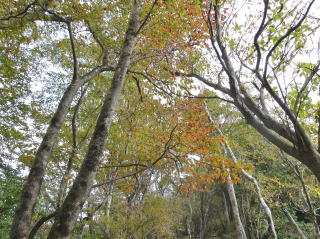 | 石段下からモミジの樹林帯を眺める。(写真下) ここも1ヶ月後が楽しみだ。 |