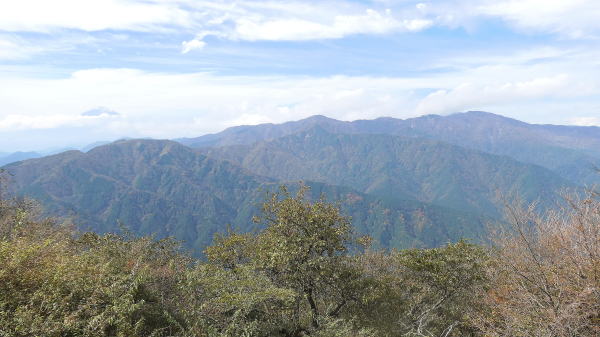 | 山頂標識から電波塔のある西側に移動する。先ほどの表尾根のガスは消えていて、富士山、三ノ塔から丹沢山まで晴れ渡った眺めとなっていた。(写真下) |