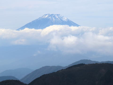 | 山頂裏手を出発し、下の鳥居に向かう。途中、久々に富士山を望遠で撮影。(写真下) 今年、丹沢エリアから富士山を眺望できたのは、4月の玄倉以来で、その後の塔ノ岳や弘法山・権現山などでは全く見れてなかった。 |