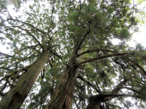13:13、夫婦杉を見上げて撮影。(写真下) 夫婦杉と名付けられているが、実際は幹が3本高く伸びている。 |