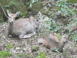 | 大山寺から下っていくと、左手にシカの親子を発見。(写真下) 撮影している間、じっとしていて2頭とも全く動く様子がなかった。 |