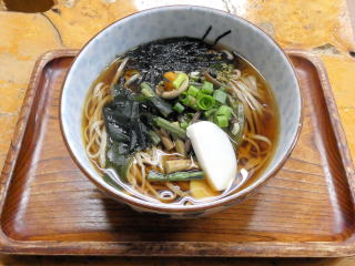 コマ参道を下っていく途中、空腹感を覚え、茶店に入り、山菜そばを注文。(写真下)