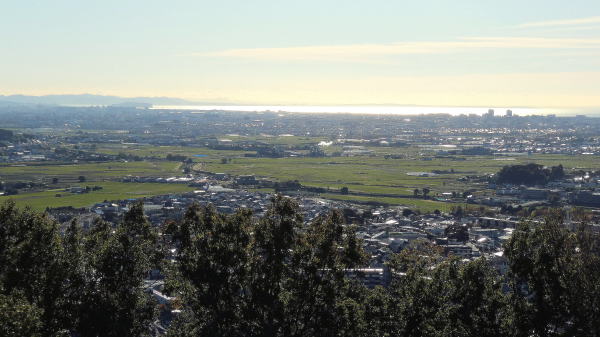 7:45、吾妻山到着。誰もいない山頂から、左手の相模湾方面を撮影。(写真下) ここは標高が低いので江ノ島が陸続きのように見えている。 |