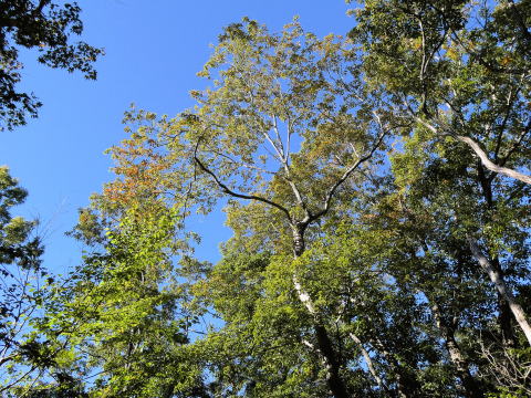 | 見上げると少し紅葉した樹木を発見。(写真下) この辺りの紅葉は、まだ先のようだ。 |