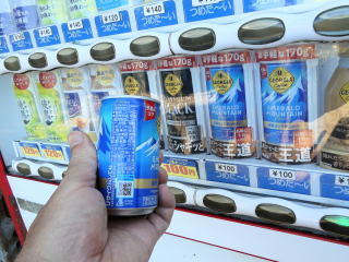 | 舗装路に下り、自販機前で小休止。量が少ない冷たい缶コーヒーを購入。(写真下) 緑茶のペットボトルを持参しているのだが、ここでは、いつも緑茶以外が飲みたくなる。 |