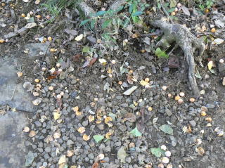 | イチョウの大木の下には銀杏が散乱していた。(写真下) 猪に見つかれば、食べられてしまいそうだ。 |