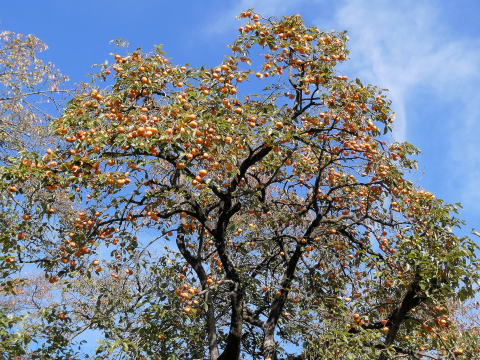 | 今日は、女坂を下って富士見の湯に行こうと計画していたので、権現山から坂を下り、再び馬場道に戻る。この時、行きでは気がつかなかったのだが、左手に樹高のある柿の木があり、物凄い数の柿の実が最上部の方に生っていた。(写真下)