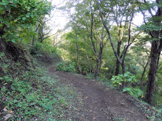 坂の斜度は、女坂というだけに緩やか。おまけに道幅も広い。(写真下左) だが、木が邪魔で表尾根方面が見えないのが残念。男坂よりも歩き易く、どんどん下っていくと、左からの男坂と合流した。(写真下右)