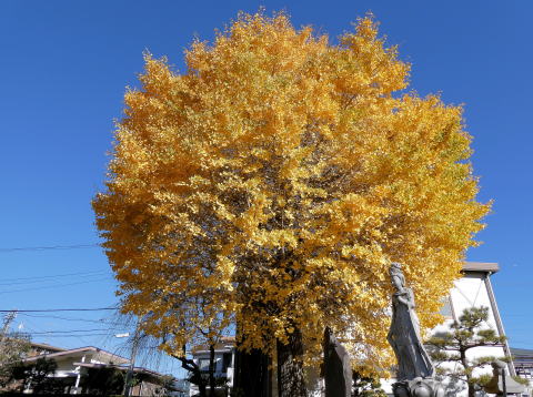 続いて何度も訪問したことのある今泉名水桜公園に向かうが、その公園に行く手前で左折する。ここは、太岳院入口となっていて、今泉名水桜公園の池(今泉湧水池)が眺められるのだ。だが、その前に見事に黄葉したイチョウの大木が目に入ったので撮影。(写真下)
