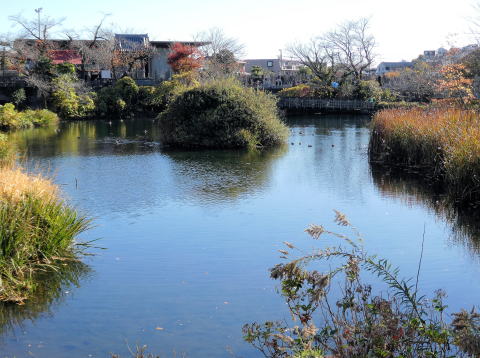 | 今泉名水桜公園に入り、今泉湧水池を先程の太岳院の反対側から眺める。(写真下) マガモたちが気持ちよさそうに泳いでいた。 |