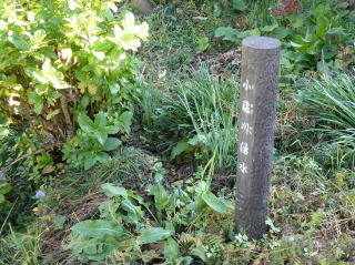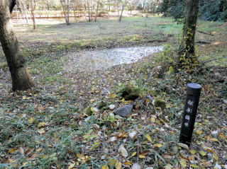 説明板には地図が描かれてあり、石柱の立っている窪地の南側半分は畑と書かれてあったが、現在は360度、住宅に囲まれている。 |