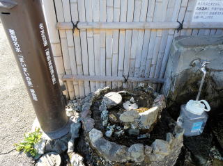 | 樹林帯の中に道があり、辿ると、湧水口を発見。(写真下) その先には立派な祠が建っていた。千年の杜の入口にあった説明板によれば、この水源は、地下51mより汲み上げ、長い時間をかけて自然の力によって濾過されたミネラルの豊富なおいしい地下水との事。撮影後、大きな容器を持った単独男性がやってきて、この水を汲み始めた。 |
