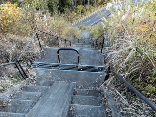 階段の遥か先に車道が見える。霊園造成のために尾根を削り、車道を通したようだ。 |
