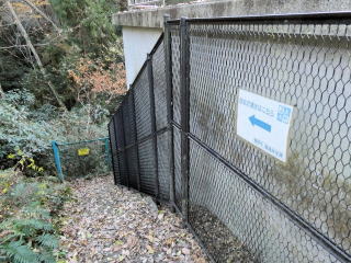 その後、右手の渋沢送水ポンプ場の金網にGoogleマップにアップされてあった貼紙(←赤松沢湧水はこちら)を発見できたので一安心。(写真下) 貼紙に従って下っていく。 |