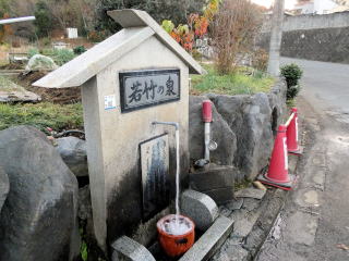 若竹の泉は、今から30年前に農家の皆さんが村おこしとして、新鮮野菜の朝市を始めたが、その時、この地は竹やぶが多くあり、野菜に加えて”たけのこ”を特産物として朝市で販売していた。農家の皆さんの力で朝市会場に”秦野=名水”より、湧水場を作る事を企画し、渋沢丘陵の室川源流にあたる山の中腹に先代の方が掘られた横穴から水を引き、現若竹の泉から横穴の水源まで800mを皆の労力奉仕でパイプの埋設をし、”しあわせの水