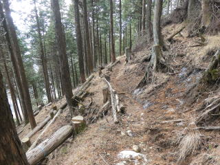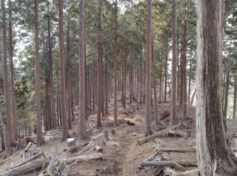 | デジカメが操作不能になったため、ここからスマホのカメラ機能を使って撮影。(写真下) フラットに近い植林帯尾根を下っていく。 |