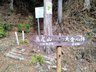 | 植林帯の急斜面を下っていき、振り返って「烏尾山→」の道標を撮影。(写真下) すると、デジカメが突如、操作不能になってしまった。レンズは出っ放しで、液晶画面はレンズからの画像を表示している。電源スイッチや他のボタンなどを押下しても何の反応もなし。メモリカードを出し入れしてみたが、操作不能に変化なし。さて、どうしたものかと思ったが、ここでは対処のしようがないので、とりあえずデジカメはザックにしまい込み、撮影はスマホのカメラで代用することにした。 |