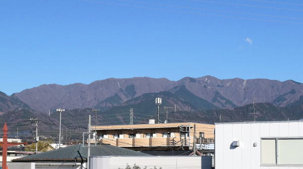 小田急線渋沢駅に9:22到着。北口のコンコースを出た所で塔ノ岳方面を望む。(写真下) 丹沢上空は清々しい青空が広がっていた。...こうやって眺めてみると、大倉尾根と小丸尾根の植林帯が目立つ。 |