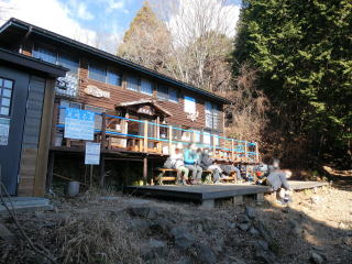 登山道は一旦下りとなるが、登り返して、12:18、堀山の家に到着。(写真下) ここでザックから菓子パンを取り出しランチとする。だが、じっとしていると徐々に身体が冷えていくのが分かった。