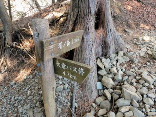 12:31、堀山の家を出発する際、[塔ノ岳2.3km、大倉バス停4.7km]の道標を見る。(写真下) 頂上までもう2/3歩いていると元気づけられるのだが、地図上のコースタイムを見たら、