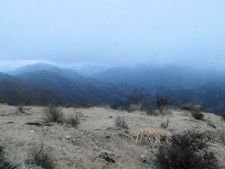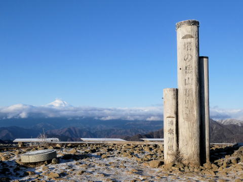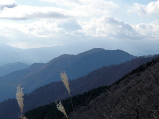 | 政次郎ノ頭ピークに寄り道して、箱根方面を眺める。(写真下) ちぎれ雲が浮かんでいると思ったら、大涌谷から立ち上る白煙だった。 |