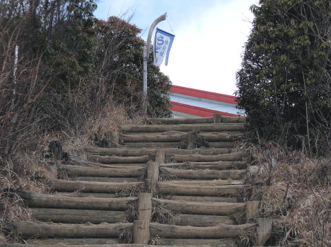 | 長い階段を登り始める。少し登ったところで、振り返り秦野盆地を眺めるが、霞んでしまってデジカメを取り出す気にならなかった。段差がちょっと高過ぎでは?とブツブツ呟きながら、登っていくと正面にうどんの招布を見る。(写真下)