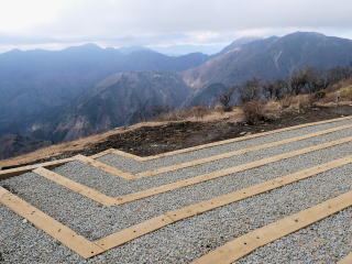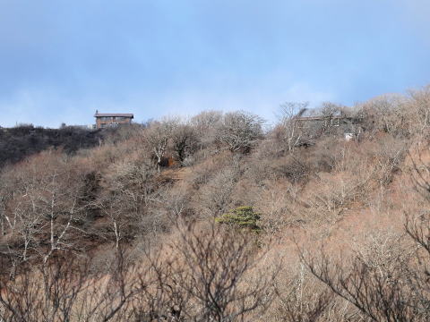 | 茶屋跡は、小石が敷き詰められ、整備されている。塔ノ岳方面を見上げると、尊仏山荘と木ノ又小屋が並んで見えたので思わず撮影。(写真下) |