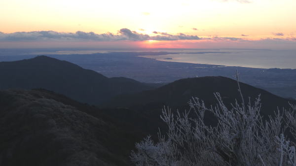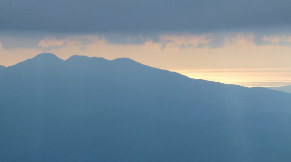 | 頂上で撮影を続ける。富士山は相変わらず雲に隠れていたが、箱根方面に目を向けると金時山、丸岳(頂上の電波塔が見える)がシルエット状で眺められ、その右奥に駿河湾が光っていた。(写真下)