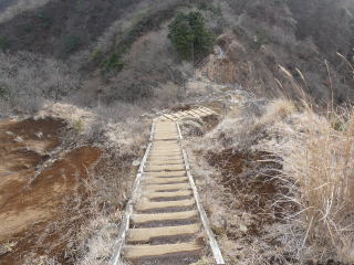 階段登りが終わり、平坦な木道を進むと、再び登りとなるが、それほど辛いとは感じない。13:13、花立山荘直下の階段入口に到着。(写真下) ここは富士山のビューポイントなのだが、渋沢駅とは違い、富士山は完全に雲の中。 |