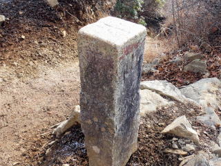 クサリ場を通過した後、行者ヶ岳に到着。(写真下左) ここには、三角点のような石標が設置されている。(写真下右) だが、その面には三角点という文字は見られなかった。いったい何だろうと思い、帰宅後、国土地理院の基準点成果等閲覧サービスで検索してみたが、基本基準点(三角点や水準点、電子基準点、その他基準点など)や公共基準点にて、成果状態が不良点を含めてもヒットしなかった。石標の天頂部には「+」の印があるが、これが間違っているのだろうか。本当は「×」なのだろうか。とにかく謎の標石である。