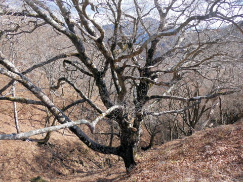 | 烏尾山に向かう途中、左手斜面に巨大なブナの木を見る。(写真下) ここを通るときは、たいてい撮影している木だ。ということで今回も撮影。 |