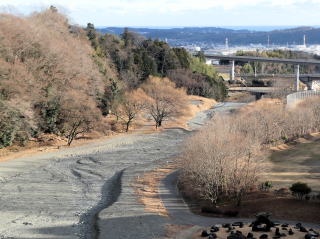 | 戸川林道から左折して風の吊橋を渡る。下流側を見下ろすと、水無川は伏流となって、文字通り水の無い川になっていた。(写真下) |